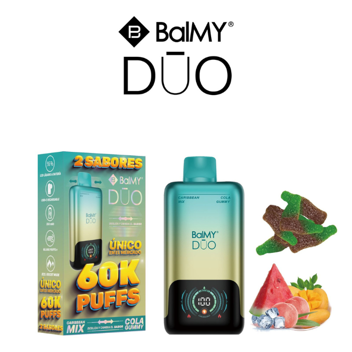 El BalMY DUO ZERO 60.000 puffs – Cola Gummy y Caribbean Mix es un pod desechable sin nicotina de alto rendimiento con sistema Dual Flavor intercambiable, 16ml totales de líquido y batería recargable USB-C. Un producto diferencial diseñado para generar rotación y aumentar el ticket medio en punto de venta.
